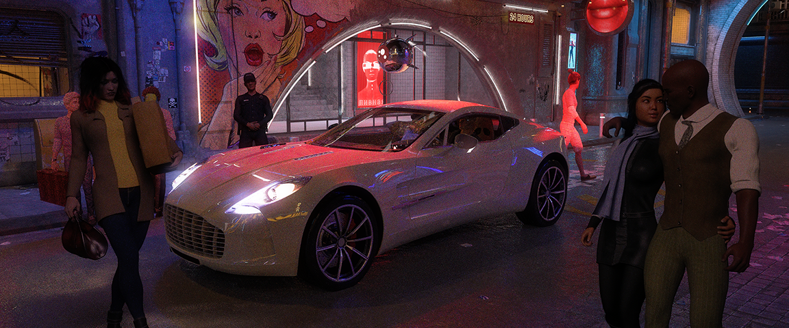 A friend recommended I purchase the Secret Agent Car. It has a nice interior, iray textures, and lit headlights. The doors open. The trunk does not. It is not scaled to fit DAZ Characters. It is too small. Scaling up is feasable, but you will make it a touch too long. I fit Owen and Boyd inside quite easily. You can (Barely) see them. I placed the car in Urban Future 5, which has some nice emmissive shaders. Unfortunately I used the beta to render this and it ended the render before it was completely done.