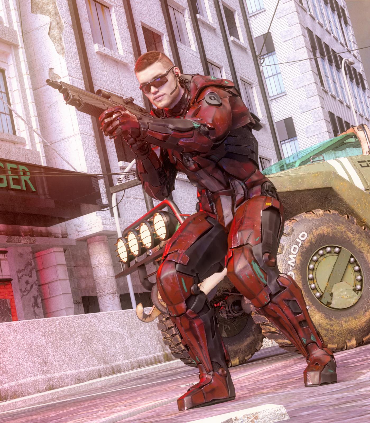 Here, I am testing out Ion's new suit Soldier Soldier X by Ion on Renderhub. This suit is really pretty great, except its all one piece. To hide the glasses you must hide the head in the body part of the suit. No big deal. I also incountered some pokethrough on the fingers, so I hid the fingers.