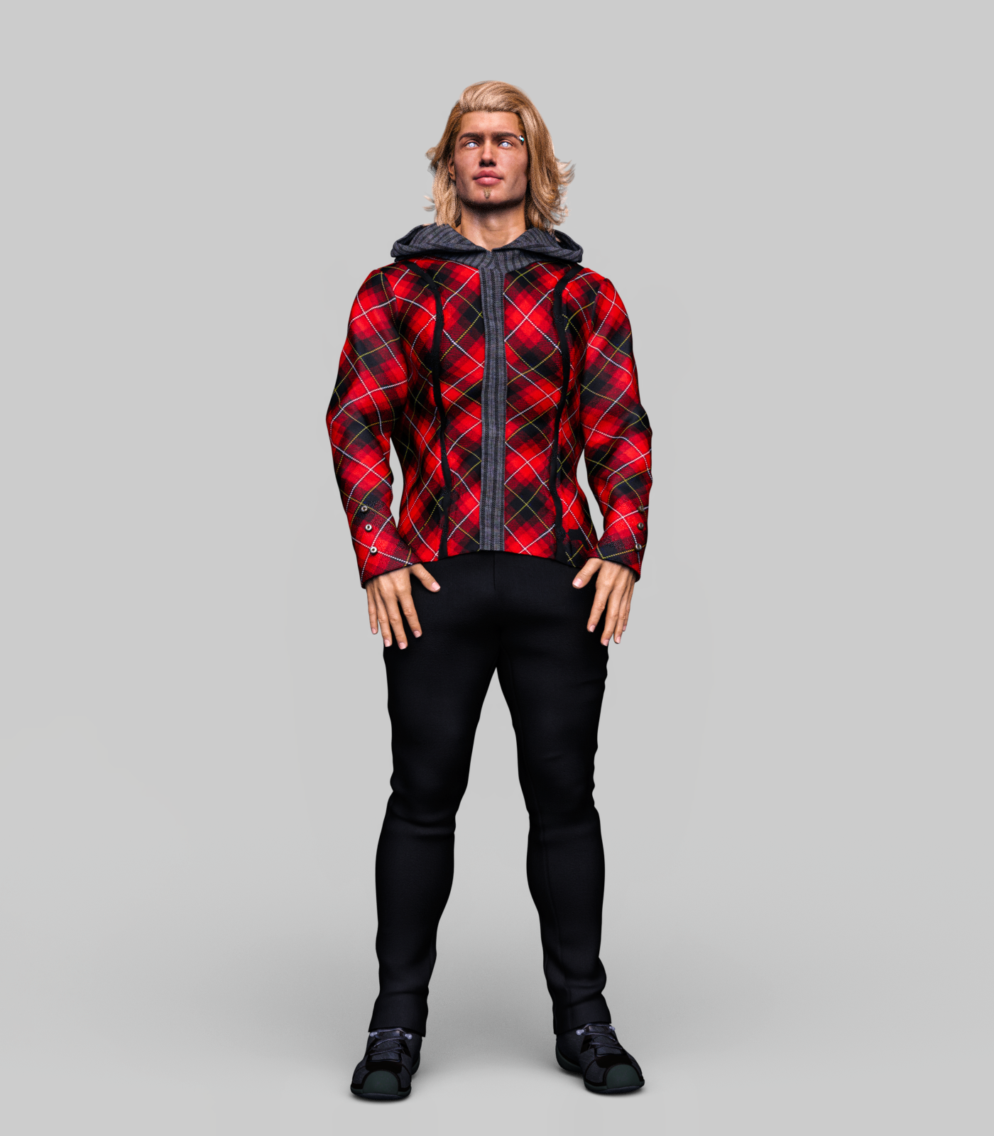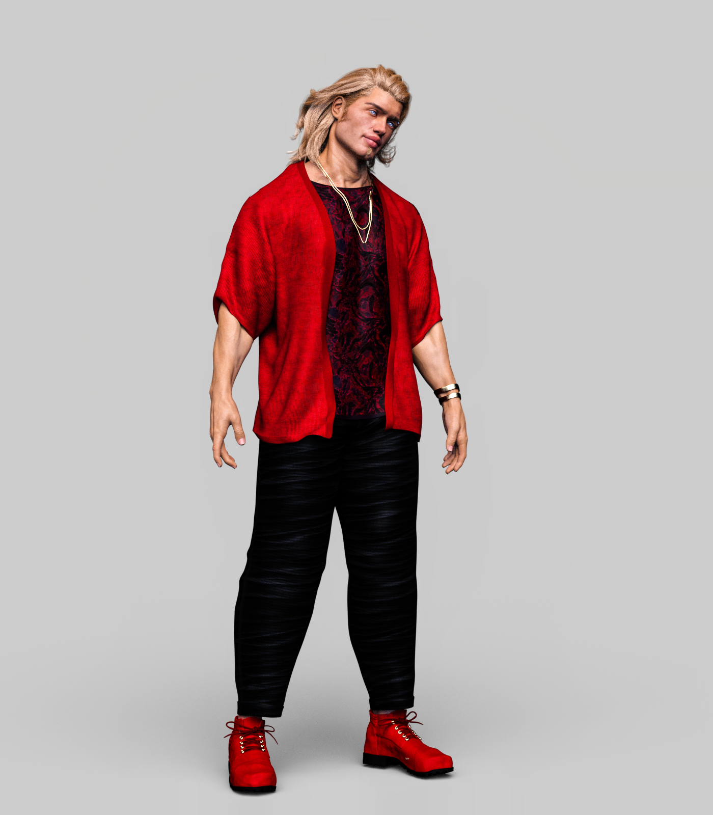 Here's the dforce Pop Style outfit for Genesis 8 Males.  (Yuzuru must like red, as this is the second red outfit in his bundle). This is another set that requires dForce to fit properly. The drape and pants will balloon if you do not.
