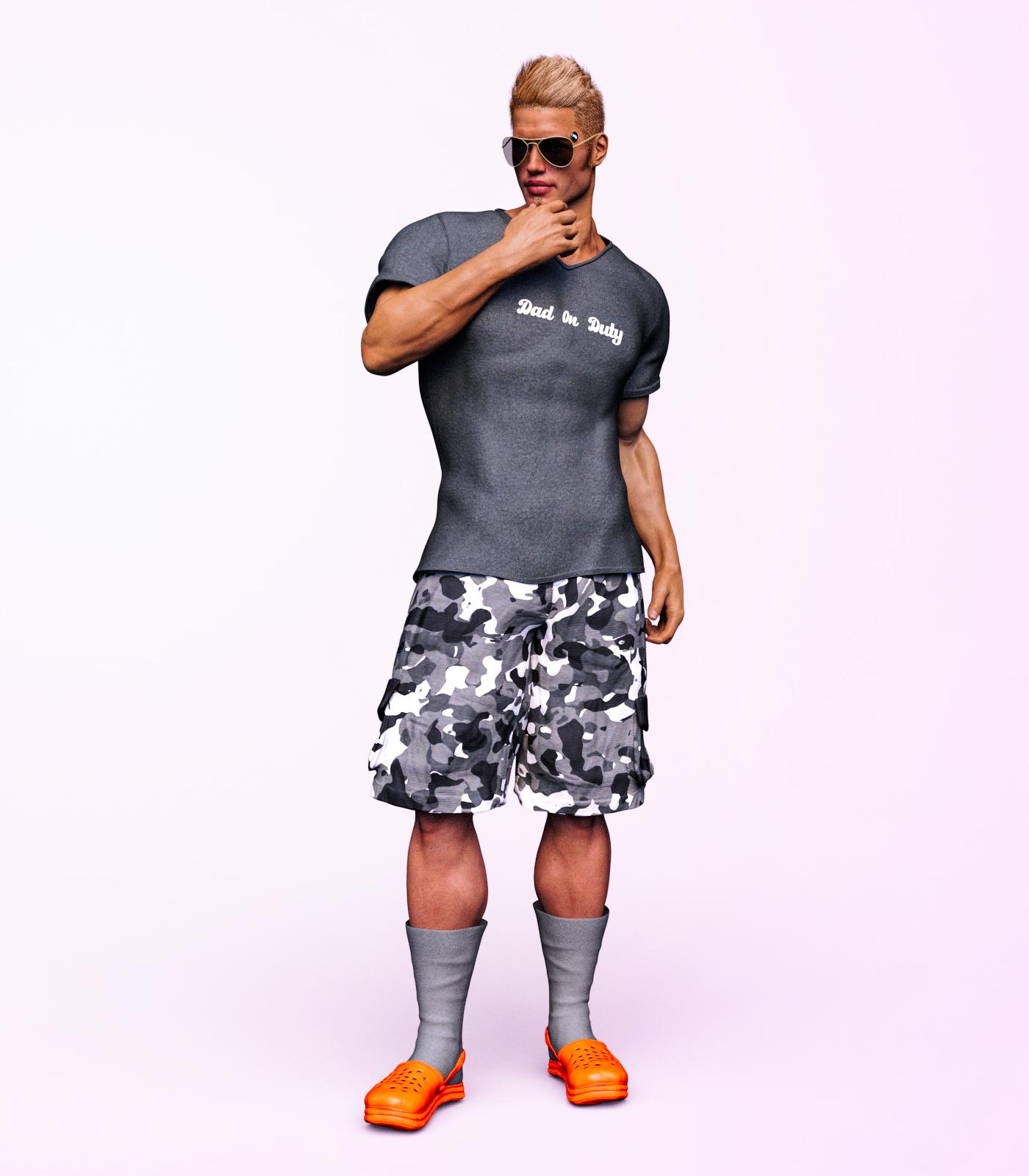 Okay, so I've just had a chance to mess around with the contents of the new character's bundle. First off is the Socks In Krokz Outfit for Genesis 8 Male. I was actually looking forward to this outfit, since it seems 'regular guy' in 'relaxation mode.' The problem I have is it just doesn't fit well, and the textures don't look like much time was spent with them (plain shirts with mostly word-processor writing).. I chose to use textures from the expansion, which when loaded has a typo. Socks in Crocs. So the textures are not in the same folder as the outfit.