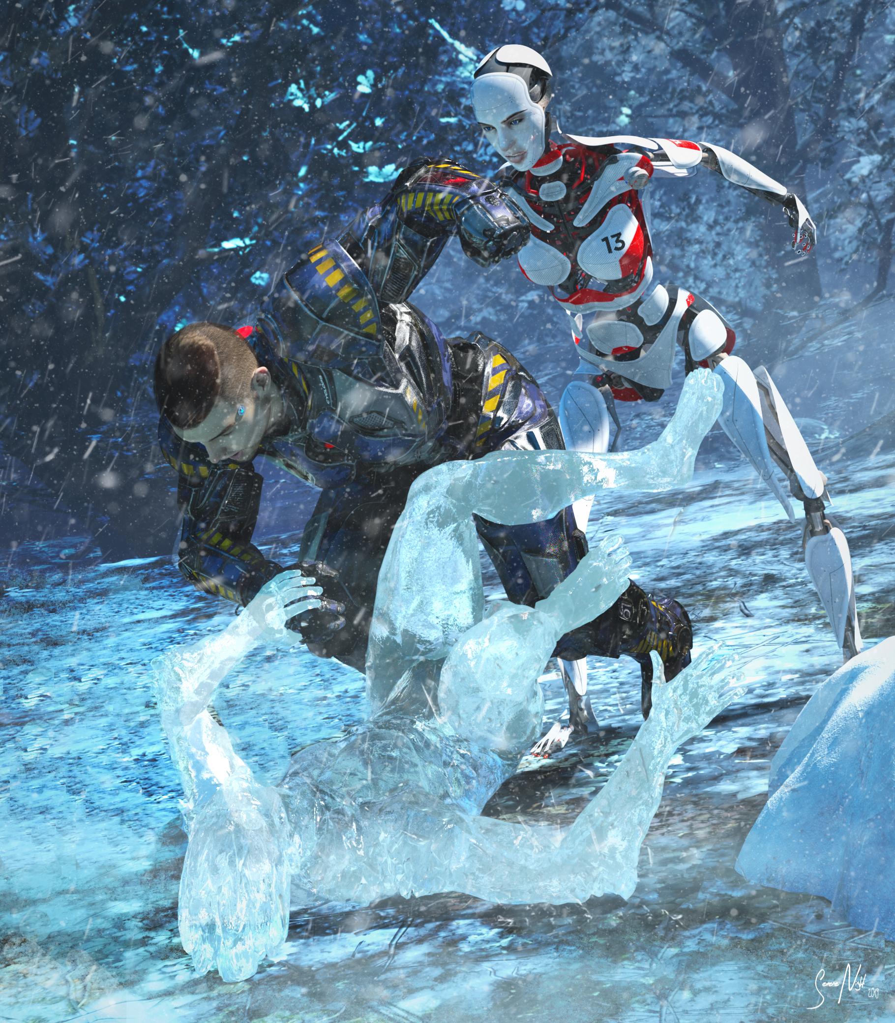 I picked up https://www.daz3d.com/frosty-and-the-matchstick-man-hd-for-genesis-8-males over the holidays, and used the ice man, for a combat image. I really liked it. Now, granted, you will pay in render times for rendering him, since he's transparent and reflective, but it was fun. The Fembot is interesting. I'm trying to move the skin and parts to g8M