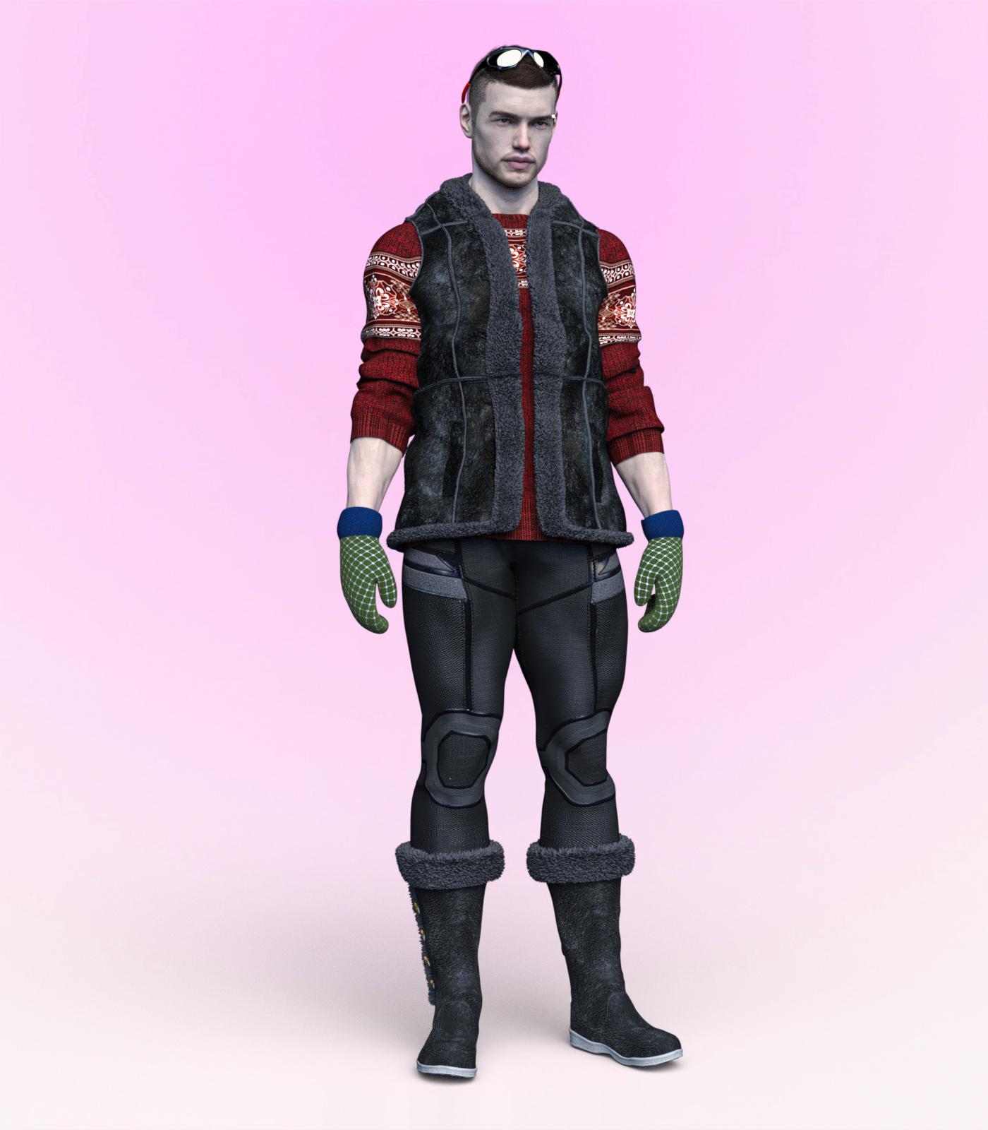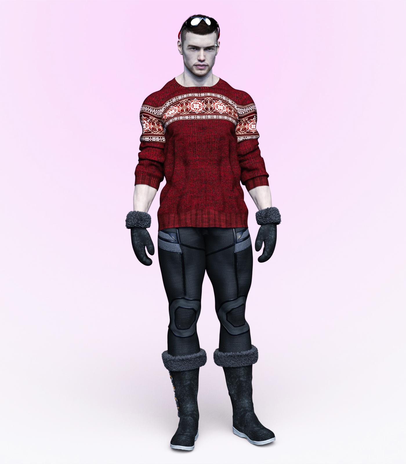 Here we have Owen in the sweater gloves and boots from this outfit. The vest, which I was really hoping to get working, is deforming a bit in the pecs region.