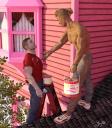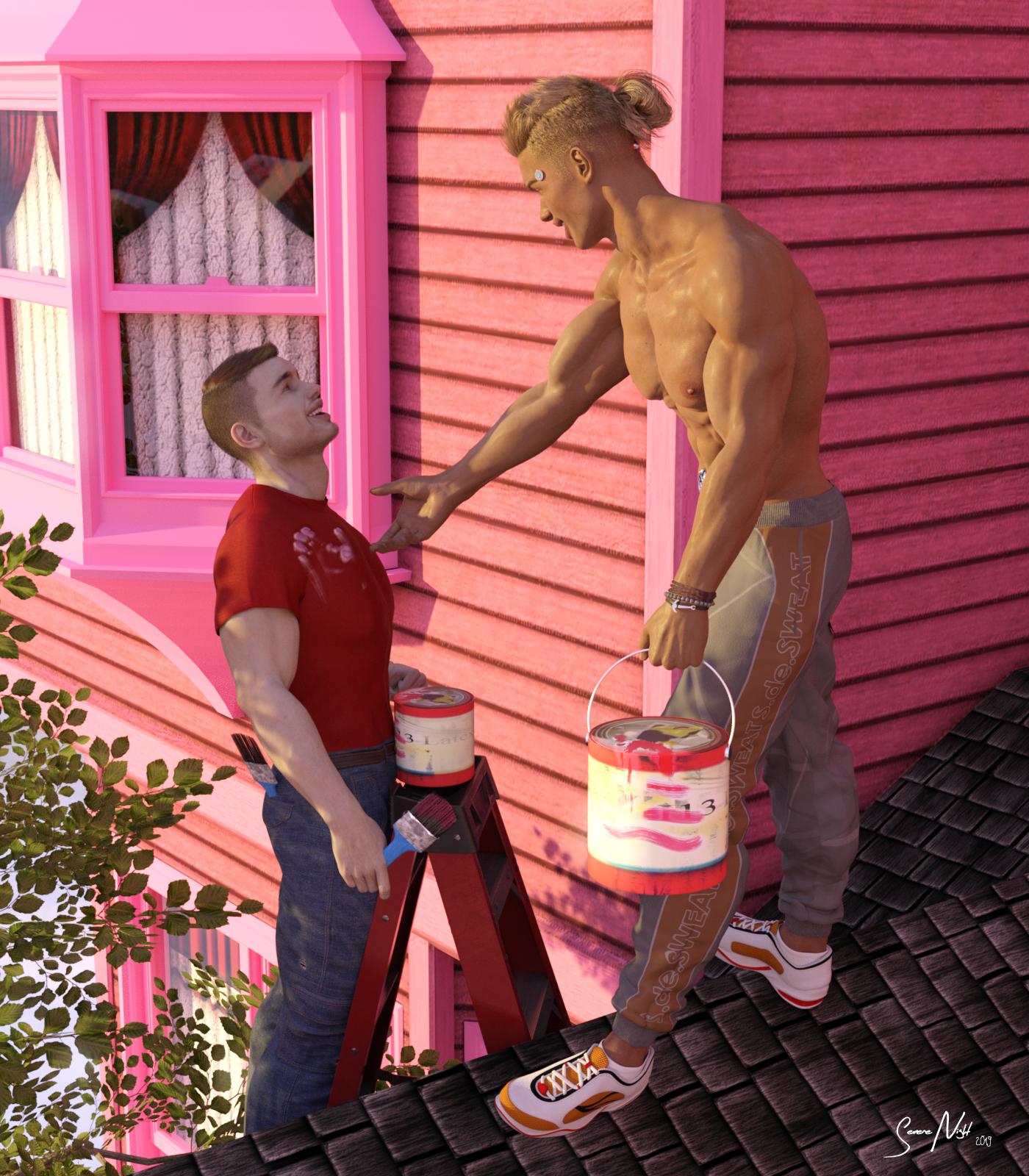 Boyd and Owen once again paint Boyd's grandmother's historic home, bright pink. I was going to paint it a different color, this time... However the windows have fake pictures on them, and the lavendar clashed with the red velvet. So I once again opted for bright pink.