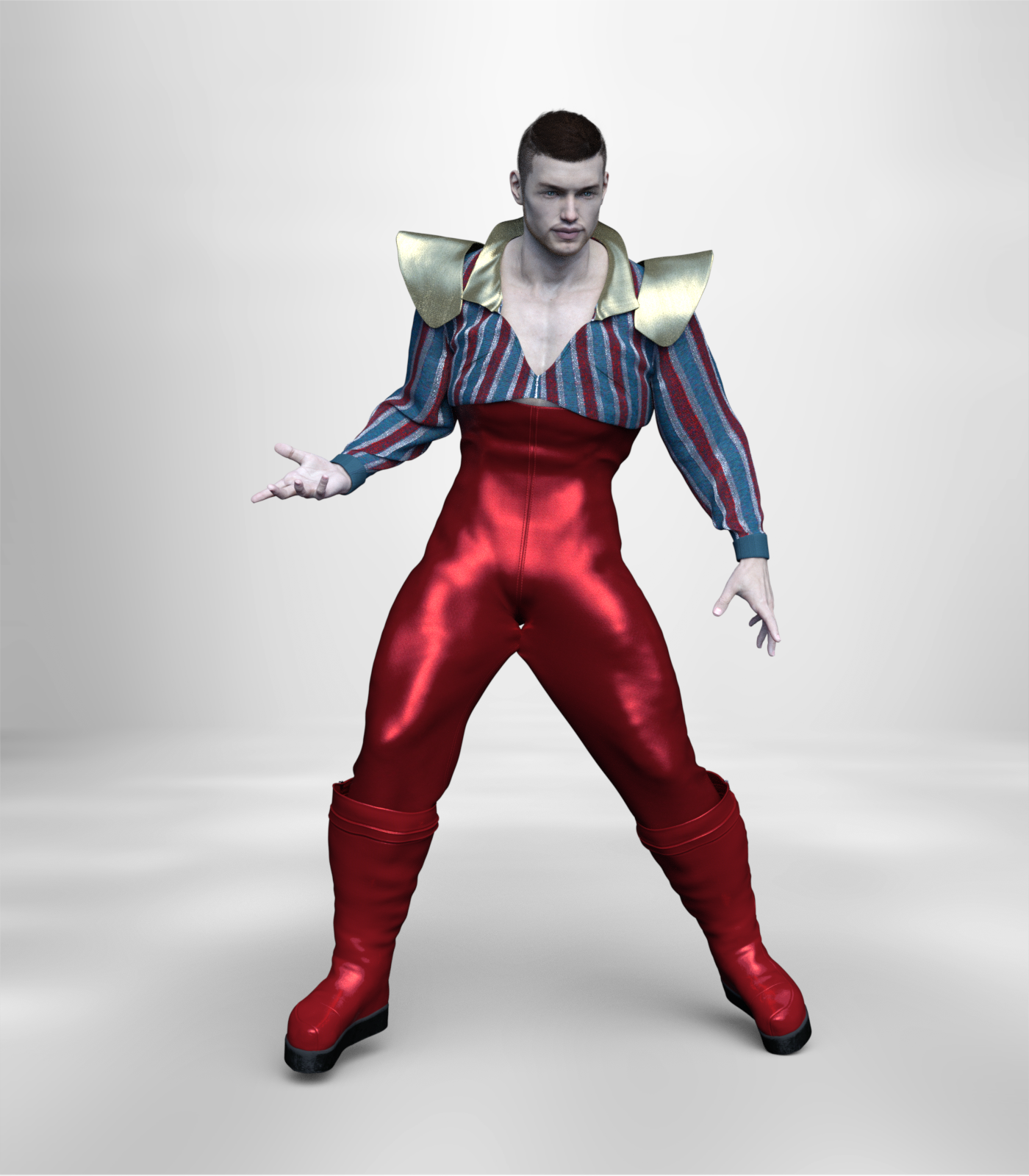 Another set, that fails the dforce test for me. It is a 70's retro jumpsuit dForce Moonage Outfit ala david Bowie. Dforce was not kind... And the bolero top and puffy pants just went all mc hammer in the center, producing scary crotch. I don't know why the displacement is so odd on the guys with certain dforce clothing, but, it just doesn't fit well to begin with. Adding dforce just is so much worse. As usual your mileage can vary, this is just me, loading the outfit, and hitting simulate, with a fairly simple pose. Even the top area, just looks like a very large woman's bikini. Definitly odd looking on Owen.