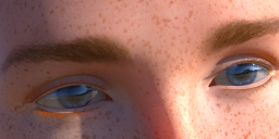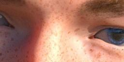 Adriano's eyelashes are red and take a separate preset to apply. Adriano does not have fibermesh brows. Up close the eyelashes look like this on the actual character.
