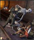 So here's my initial render. It features Owen using some night goggles and doing a signature body slam to knock a gray alien over who is threatening a teen girl. There is already one defeated alien cowering on the floor. Sadly I didn't notice its left hand is floating above the ground which is a pose peeve of mine..., but I will conceal that fact later!