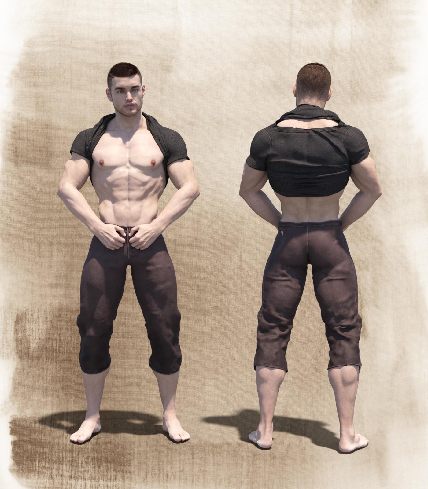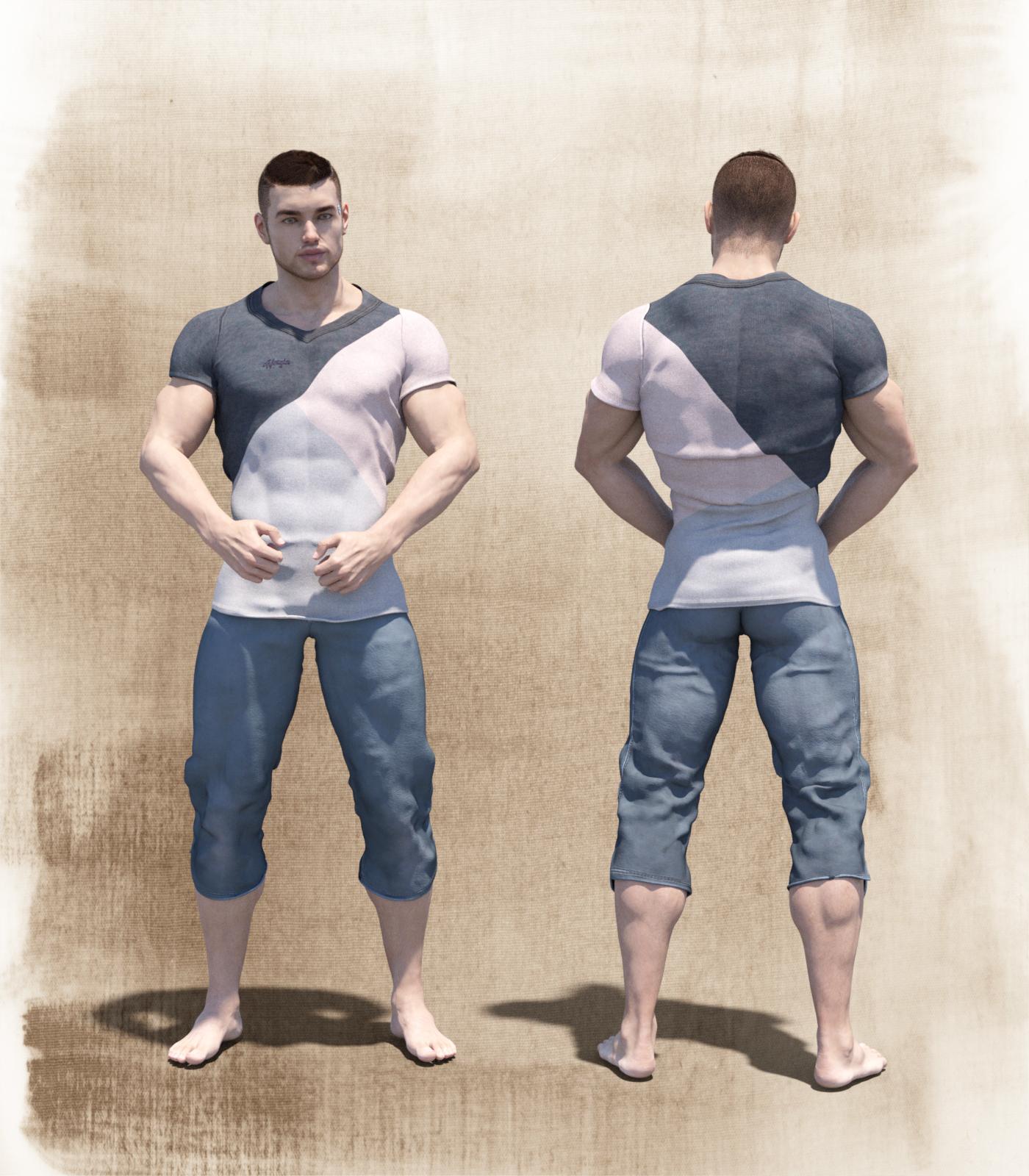 Everyday 2 set by Aeon Soul. It has 3 texture expansion, each with a different theme and several texture options, most of which aren't shown. The set includes the option to twist the top behind the shoulder for a short bolero-style top. All pants and shirt art the same style, capris with a t-shirt. There are no shoes. The set is dforceable, and includes settings to make it happen. Fortunately it is not required, since I dislike dforcing tight mens things.