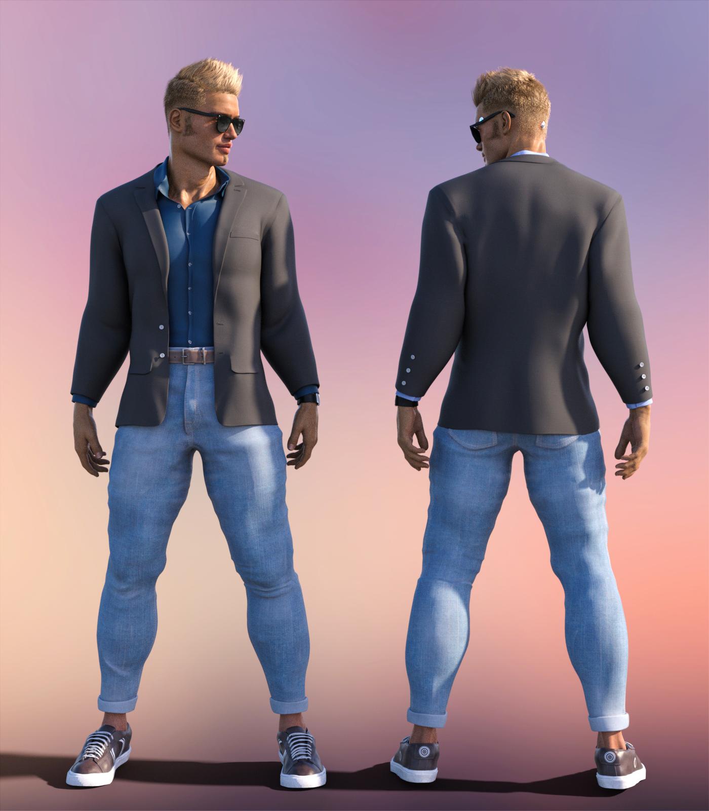 Okay, here we are again, taking a look at men's outfits. This one is dForce Modern Shirt and Blazer Outfit for Genesis 8 Male. It is a blazer, high-waisted jeans, jacket and tennis shoes without socks. Accessories include sunglasses and tennis shoes.