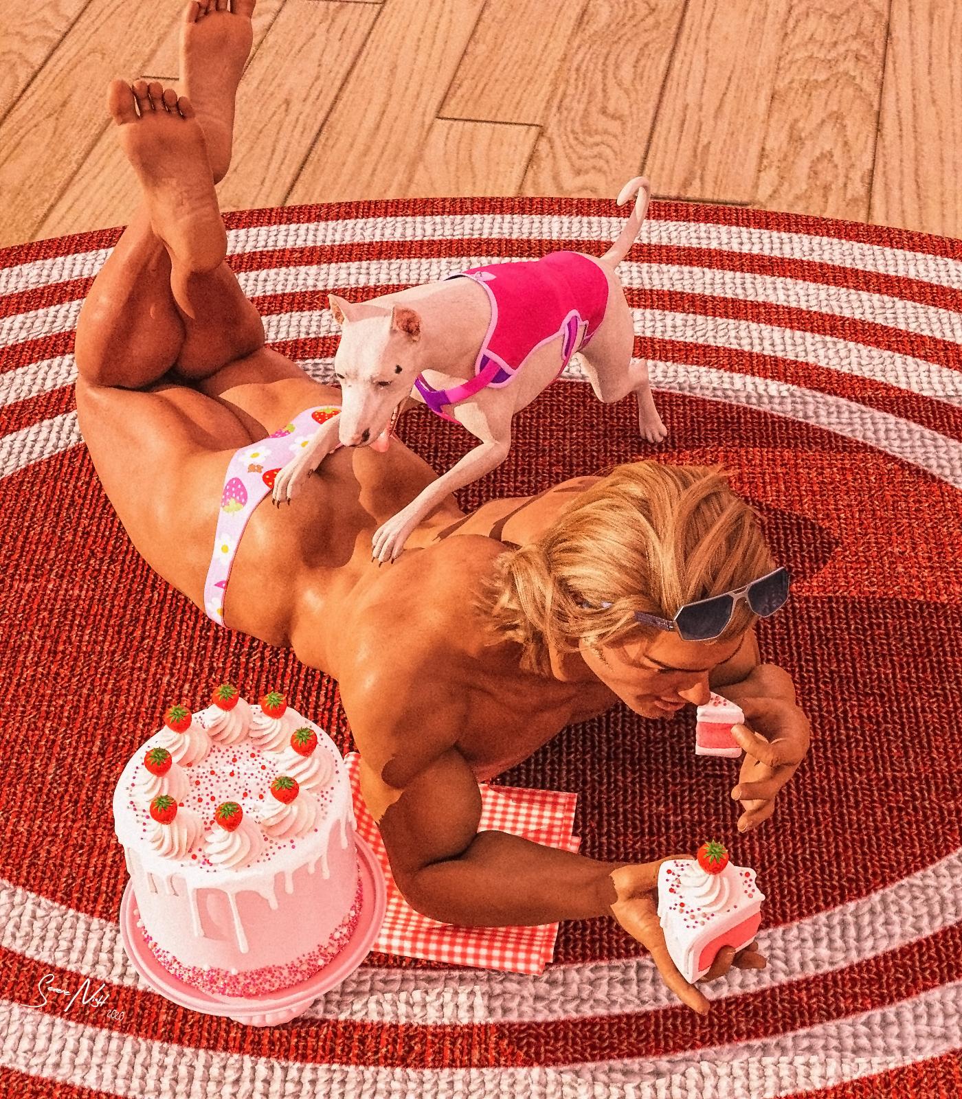 But don't worry about the unblemished cake for too long. Bitsy thinks all things on the floor belong to doggo.