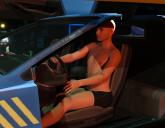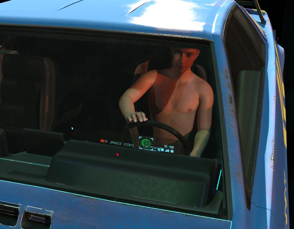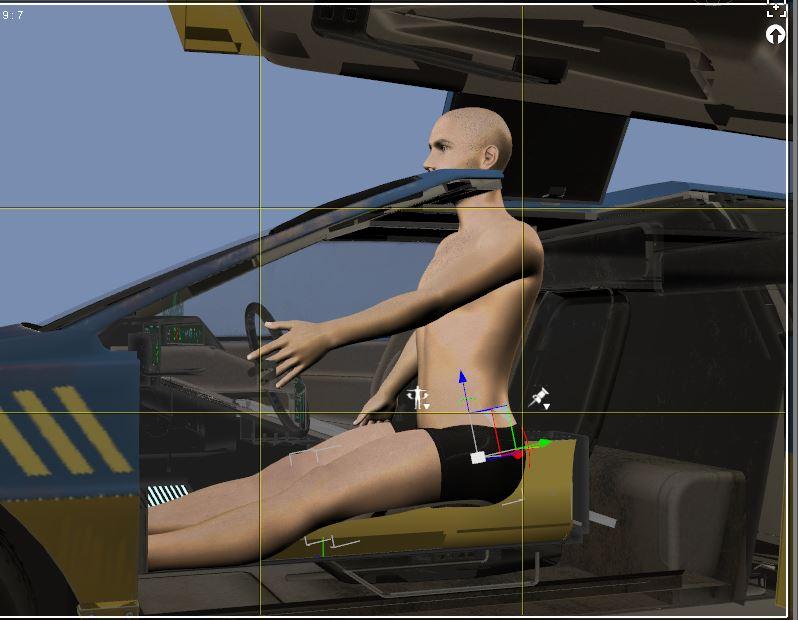 Okay, by increasing the size of the vehicle a whopping 120 percent and adjusting the seat, G8M At last fits in the cyberpunk car without clipping anything too badly However.... Ths car is now a giant tank, and the placement of the steering is difficlut to grasp. (Don't ask me whats going on in the back  of this vehicle. I can barely see any of that business until I hit the render button).  Passengers are in for a very bumpy ride I guess.