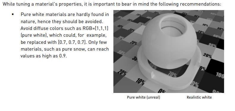 The colour we see is reflected light and is based on the absorption of the reflective surface. Snow looks white because it reflects all the colour spectrum but not equally. As it is water based it absorbs the reds first so snow, and ice, can look blue at times. All coloured substances are the same and what we see is the spectrum that is left after the light is absorbed by the surface hence nothing is pure white. In photography I use 250, 0.96:0.96:0.96 in Studio, and tend to use that in all the whites used in shaders that don't have a diffuse map. I have also used 217, 0.70:0.70:0.70, but not all renders and light react nicely with that setting.