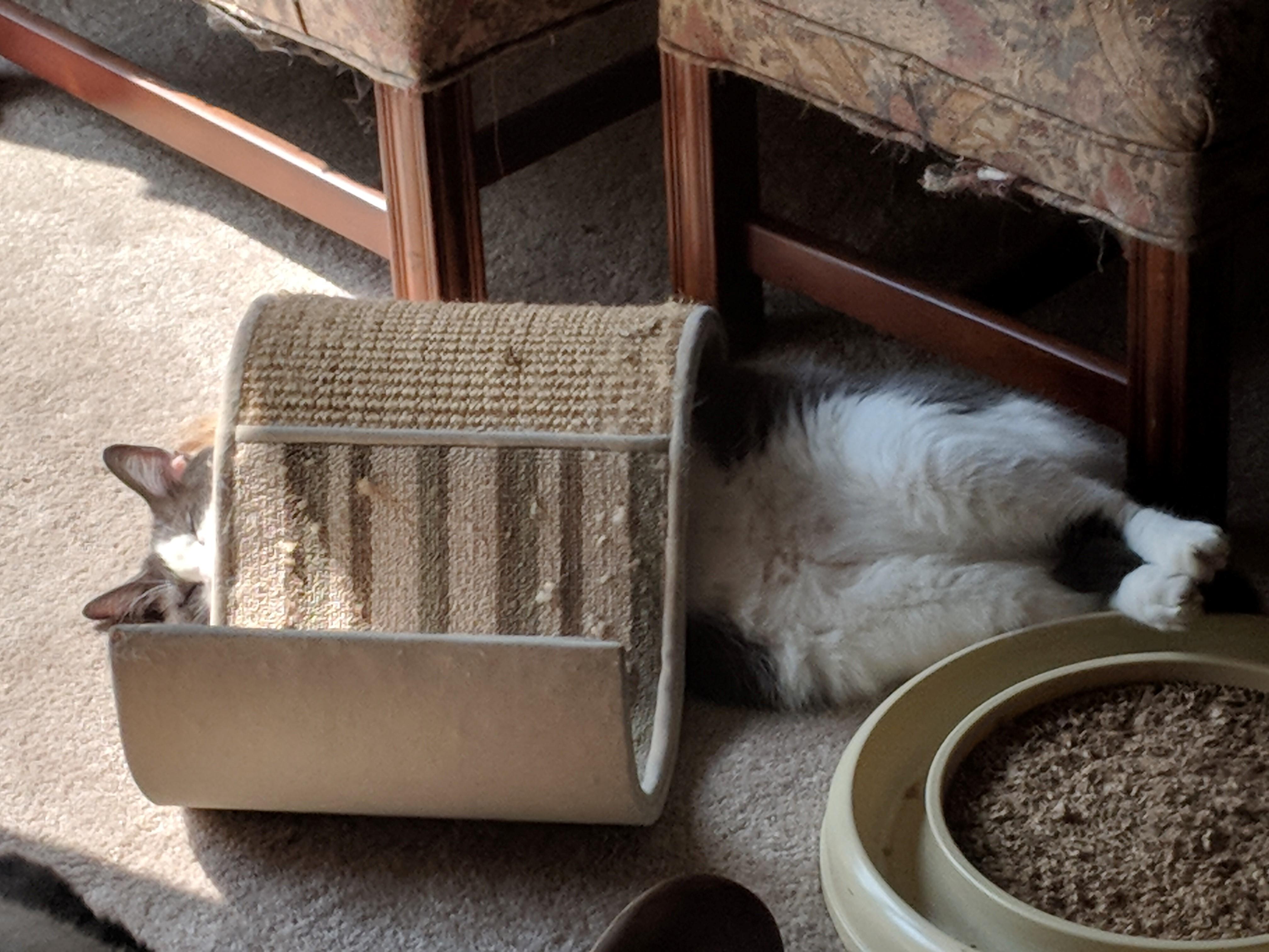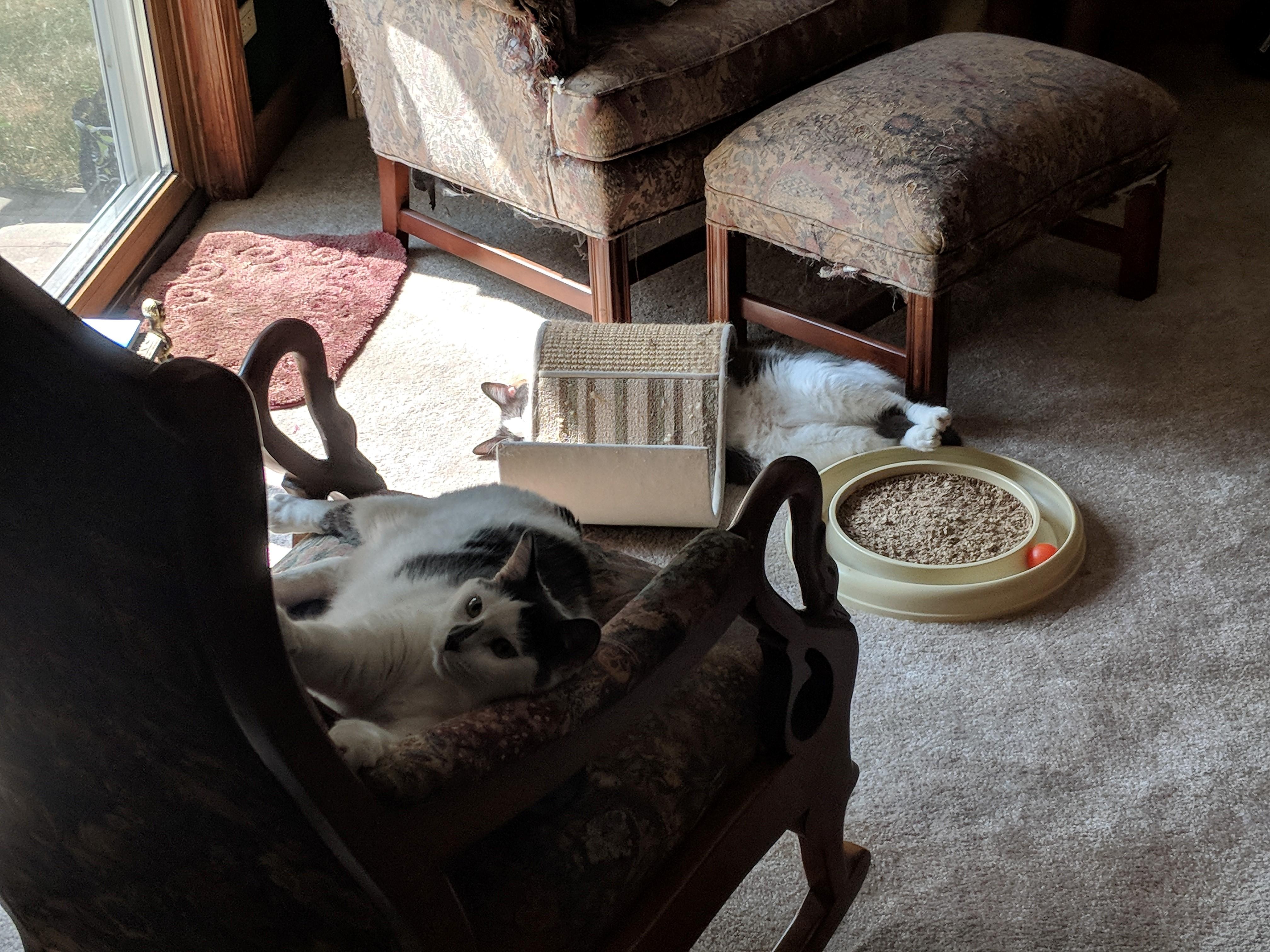 Two kitties. The one curled up in back is Xander, and the monstrously large, smokey grey kittie is Ghost.