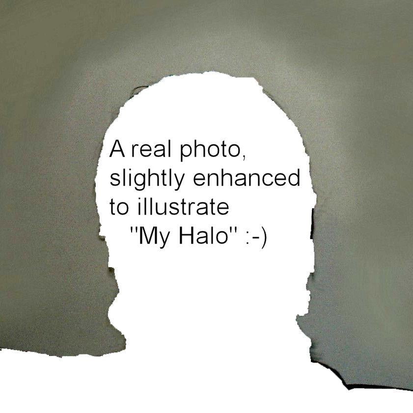 I told somebody once how it is at times I can see it ... and it can change shapes too ... and she got real mad at me and told me not to do what I can to see my halo ... then one day somebody took my photo with an inexpensive flash camera ... I have checked that wall over and over, took several photos of it at the time, the paint is even toned. Given how dark my image was, it was not due to the flash ... had to enhance the photo to see me ... and that's why it looks perhaps a little stronger but anyhow ... struggling with many issues these days ... just want to show somebody, my halo.