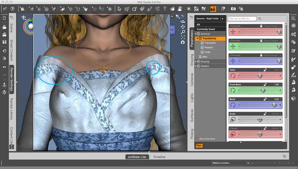 One of you two (or anyone) might be able to help me with a slight issue I'm having with the Dragon Princess Dress. I'm getting clipping between the outer dress top's trim and the "Top Border" piece. The latter is poking through the former no matter what adjustment morphs I add or what Smoothing Adjustments I make. The only thing that "works", if you can call it that, is turning the opacity of the Top Border to 0 and thus hiding it completely. Unfortunately, the dress really doesn't look right without it. (I have the opacity for it set to 50% in the attached image) The circled areas of the linked image below show what I'm talking about.