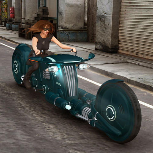 This is another fun creation by Petipet. This bike has smooth lines, great little headlights, and a realistic sci-fi flair. It comes with two poses, and FOUR color options. (I particularly like the dark blue (shown here) ). Poses place your genesis figure in the riding position, at least mostly however, I found the poses did need to be adjusted to fit this v5. I recommend scaling her to 100% to get her to sit on the bike, and you will need to do some adjusting to fit the handlebars to the hands.