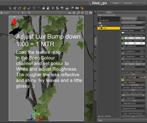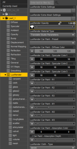 So the ivy leaves aren't rendering the alpha in LuxRender. Has anyone else had a similar problem and can you tell me what you did you fix it? I applied the Luxus LuxRender Material to the leaves shader and chose "All with switcher". I have scanned through all the specific LuxRender settings as well as the Leaf_1 shader and I am not seeing anything that can help me.