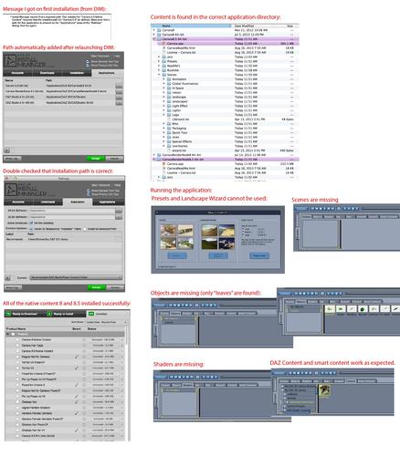 Deadspeak. Is all of your content at the old path? DAZ is phasing out the old library path, and installers. You should use DIM to install all of your content, it uses the new default path. If you try to use a custom path, nothing will work. But, with that, you also need to remove the old directory path and "map" to the new path in DAZ, and Carrara too. It's pretty easy to do. Basicly you just change the directory path from the old to the new (Users\Shared\My DAZ 3D Library).