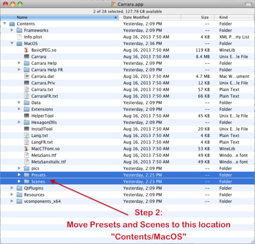 Notice that there are three folder in this location: pics, Presets, and Scenes. They need to be moved into the Carrara.app application package.