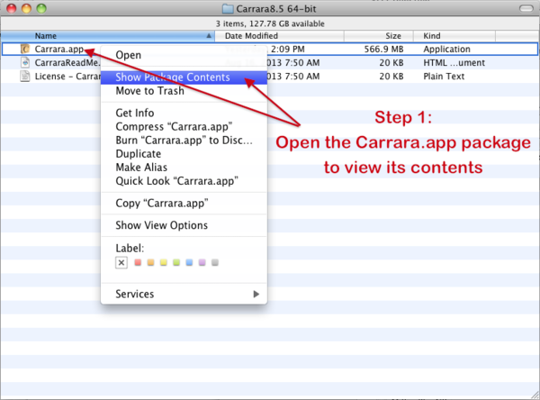 To do this, Control-click on the Carrara.app file and select "Show Package Contents" from the menu.