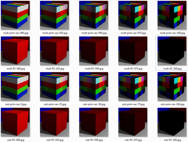 Does anyone know if there's really a difference between the Layer Subtract and Layer Multiply operations in Shader Mixer? I ran some comparison tests using colors and I'm really not seeing any difference between them. See the attached images, in which I multiply primary and secondary colors together, as image maps and as color values.