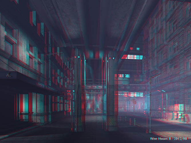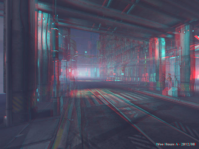 Using Stonemason's Urban Future 4 viewing from 2 different angles, and 2 Victorias. Anaglyphs directly rendered in Bryce using the ALST+.