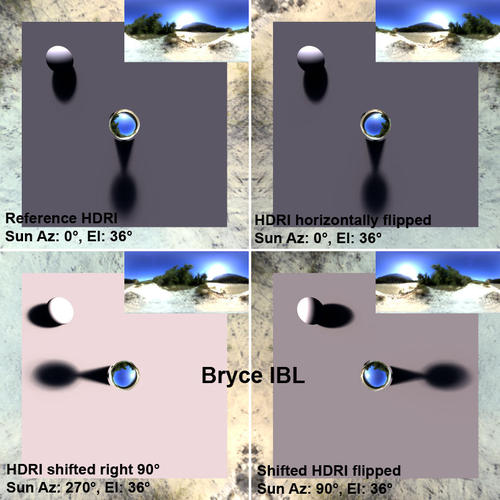 Also in the Bryce examples, only the HDRI was exchanged. The light shines from the expected direction, the shadows are cast away from the sun and their shape is correct.