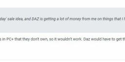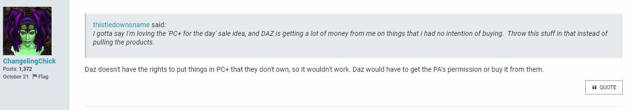 But that's not the sale; PC+ members are getting an extra 10% off the sale for PA new releases for a day, but they are not in the spirit of being a DO for the day... also PC+ items are buyouts where PAs receive 0% of the sales.. so you could imagine PAs probably would object to DAZ taking all the profit for themselves.