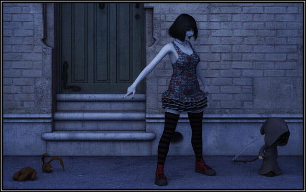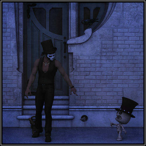 I'm not sure if Lil Death Godfrey counts; he's not a DAZ figure, exactly, but he is sold at DAZ. BTW, I'm sure Dead Bunny will be fine, if a little peeved -- he is hanging out with psychopomps. (But I bet he'd feel better if he could nibble on that carrot-headed guy...mmmm, grilled carrot!)