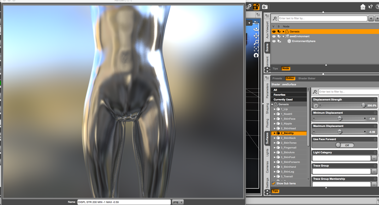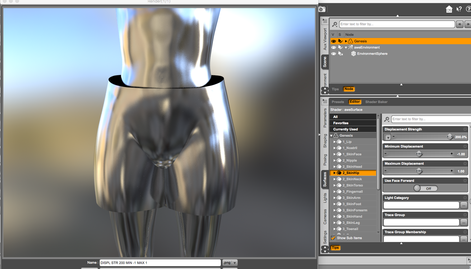 Displacement works in mysterious ways. Mid gray is zero displacement, right? I've made a number of displacementmaps for my characters. I use them with LIE. I have a "zero displacement" 128,128,128 base map that I load into LIE, then add various layers as needed. This has worked very well for years with the vanilla 3Delight renderer/shaders. Now I loaded the base Genesis figure, applied the awe base shader, just made it reflective to better illustrate the issue. And the awe environment sphere with the default ruins HDRI. Inserted the base displacement map into the hip displacement slot. First render is with displacement strength at 200%, min value -1, max value 1: