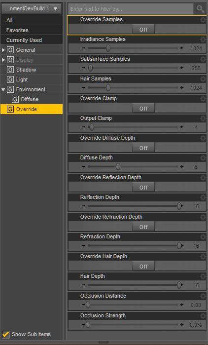 Overrides applies the override value to all my shaders (environment shader, AWE Surface, AWE Hair etc). They won't work with any other shader. One neat thing is that you can set reflection depth to a different value from refraction depth. Not possible with the specular bounce depth in the renderer settings or shader attributes. Turnng down bounce depth to 1 for both diffuse and reflection can speed up your renders to roughly the same as enabling progressive (though it depends on the scene).