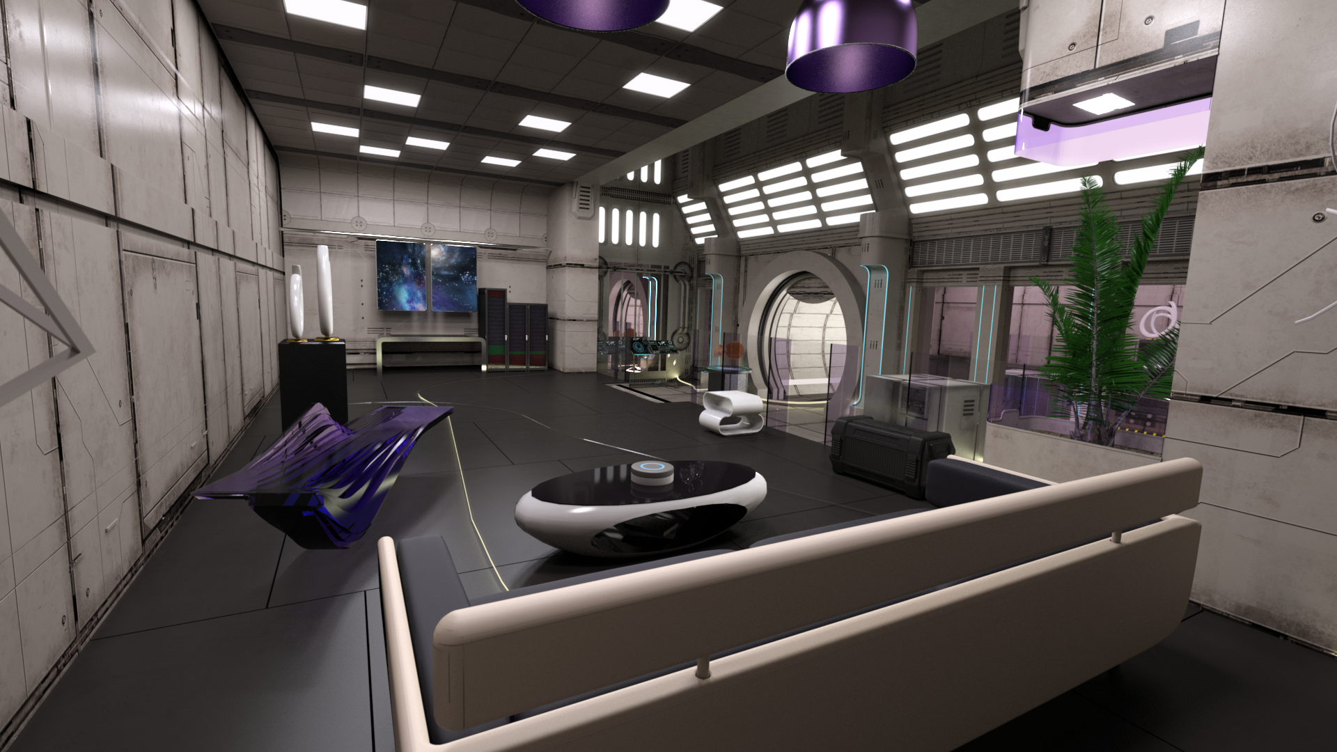 Latest version of the Space Livingroom, with cranked up lights and further tweaked surfaces. Don't know what to do with those IMO weird floor leds, maybe simply hide them? Strange design decision...