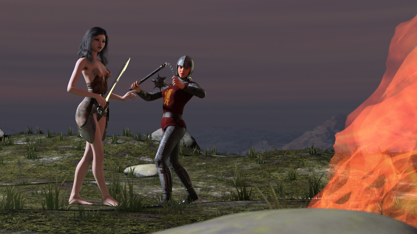 So working a bit more on this scenario. Had to use SS, not translucency, on the grass clumps, realised they had actual thickness. The char on the left uses the coat. Maybe it's not so bad after all, hmm...
