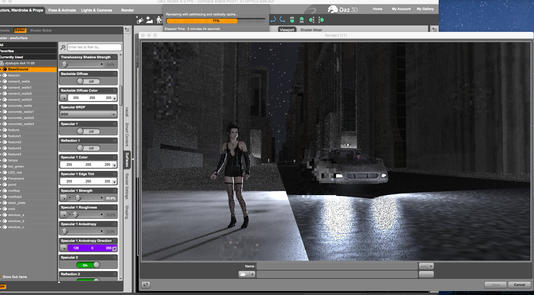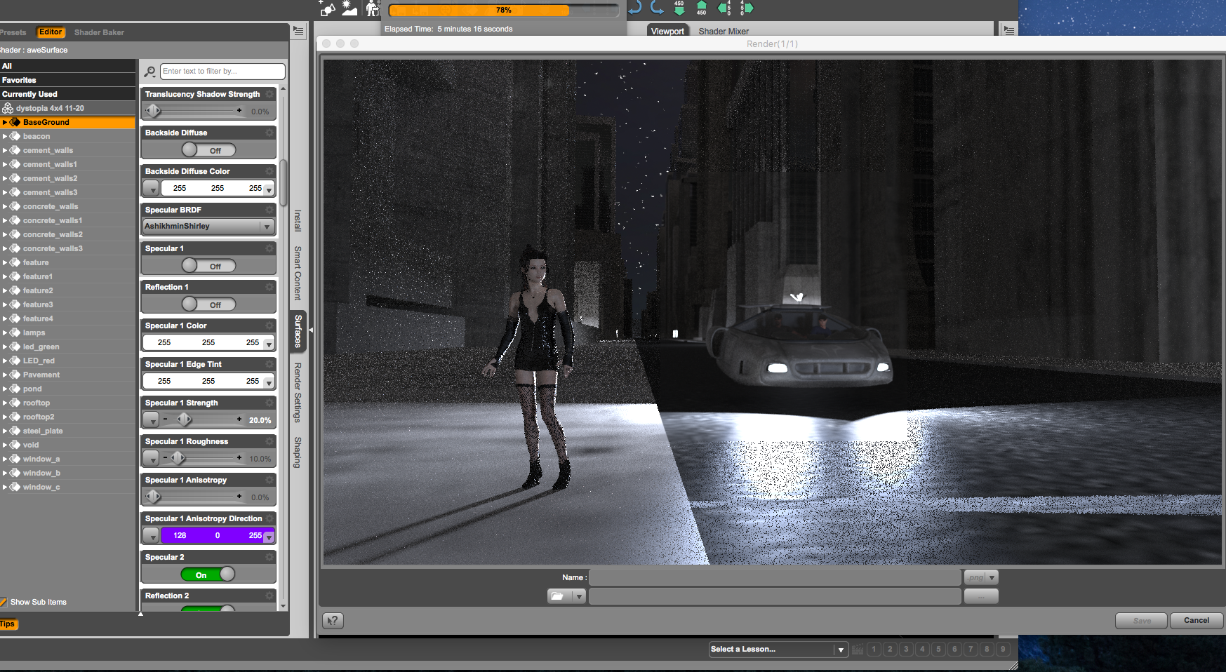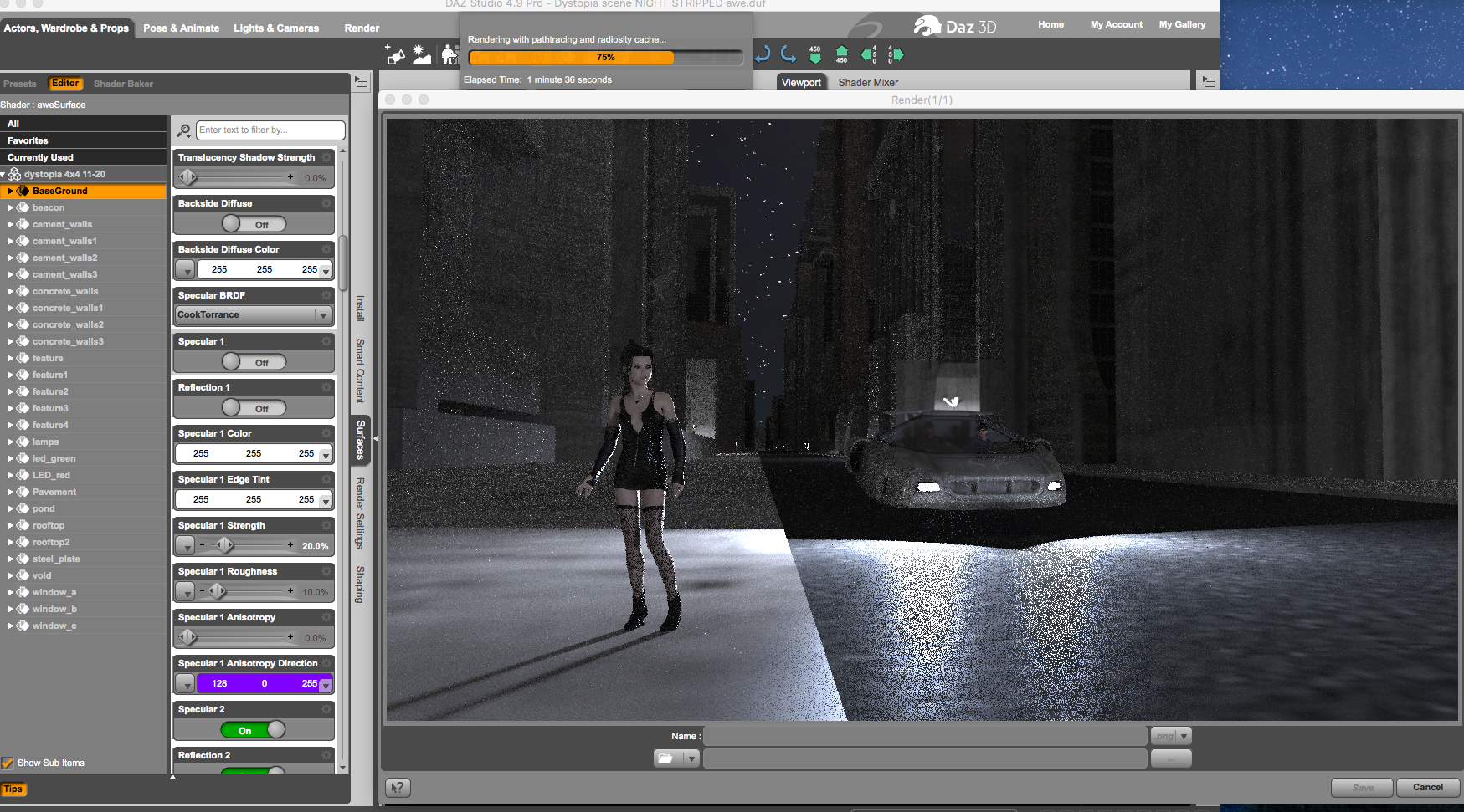 I stripped down my Dystopia scene as much as possible, hid everything outside the camera, deleted all instances of the skycar, applied the environmental shader for the Dystopia lights insetad of using the area light shader, changed the shader for the headlights on the car to the environmental shader and used 2 emissive planes instead, disabled the "use face forward" for everything, set Irradience samples to 128 for everything. Started testing the specBRDFs one by one for the asphalt. Here are screenshots for each BRDF in scripted progressive mode: (Tried to time it so it would reach the 75% mark)
