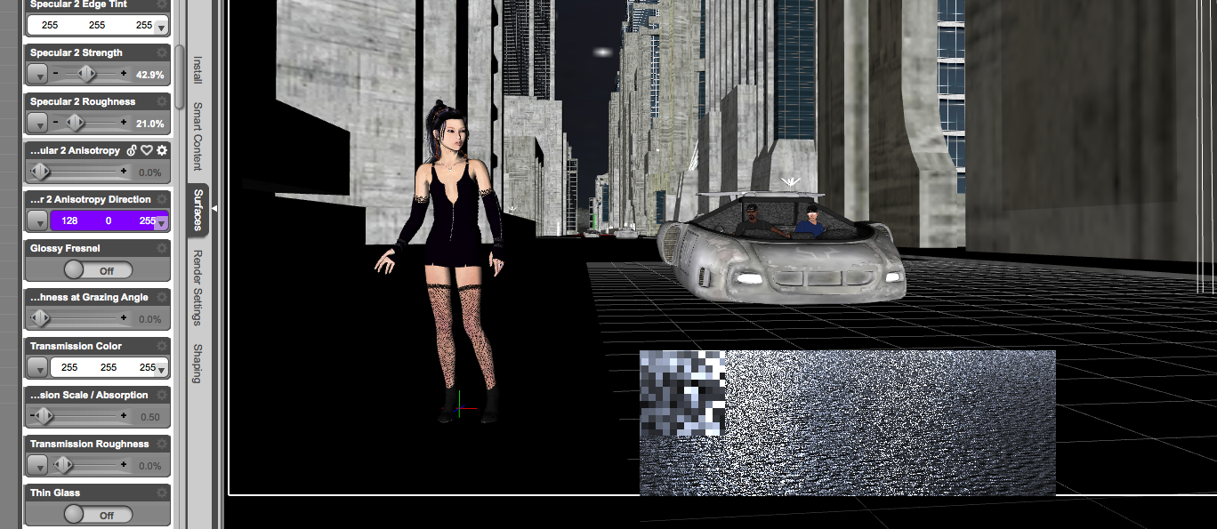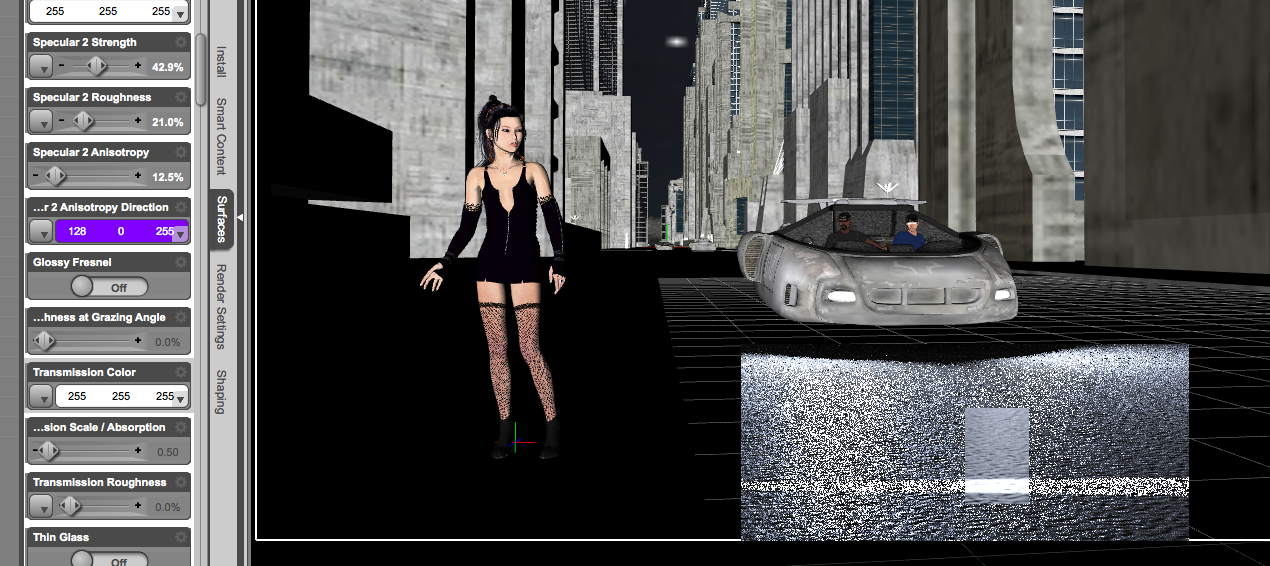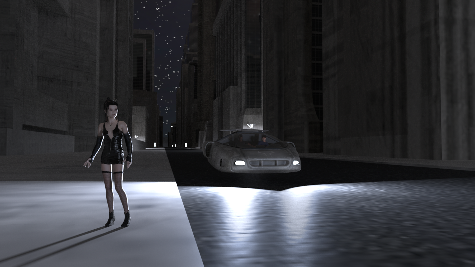 I stripped down my Dystopia scene as much as possible, hid everything outside the camera, deleted all instances of the skycar, applied the environmental shader for the Dystopia lights insetad of using the area light shader, changed the shader for the headlights on the car to the environmental shader and used 2 emissive planes instead, disabled the "use face forward" for everything, set Irradience samples to 128 for everything. Started testing the specBRDFs one by one for the asphalt. Here are screenshots for each BRDF in scripted progressive mode: (Tried to time it so it would reach the 75% mark)