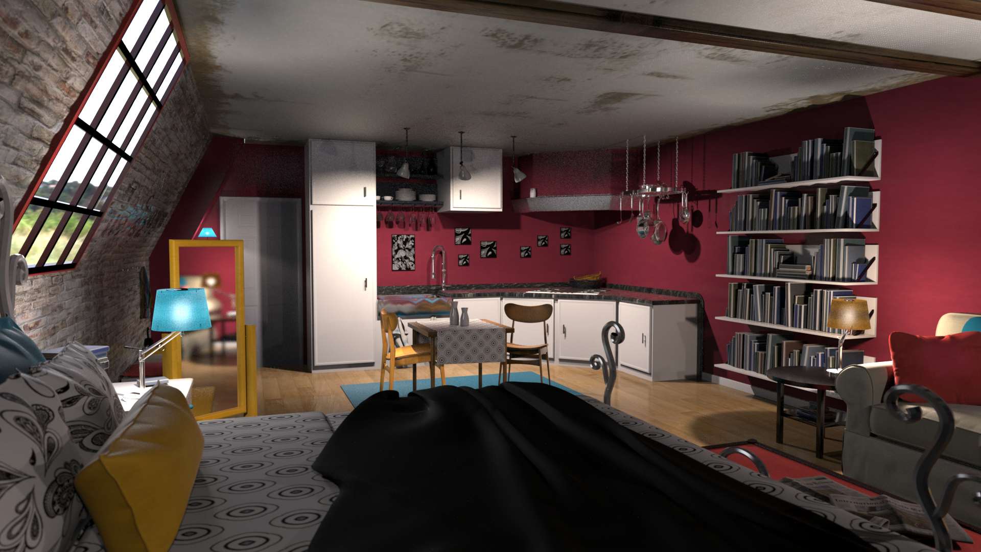 A render with interior lights, ended up using 14 emissive planes + HDRI... I think the lamp shades are pretty close to what I had in mind, although they could use some minor adjustments, as well as some other things. The biggest problem is the mirror, I'm sure the upgrade will solve it;) No other problems with converting this set really, the books and one of the slippers on the floor had black spots before I enabled the "use face forward". And there's a bit of grain, which should be an easy fix by upping shadow samples.