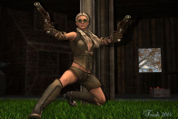 This required soooo much post work I am not even sure if I want it here or not......I could not hide the hands...kill all in scene files killed all in surface files on hands.....sky through the window did not render all the way out.....not my day.....Janie's got two guns.....