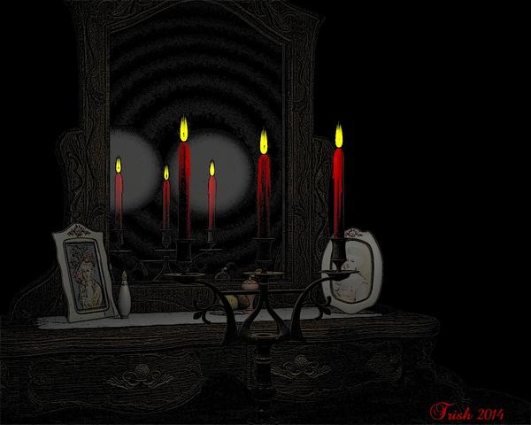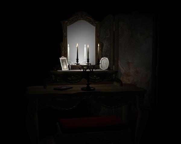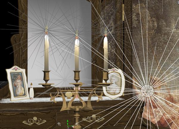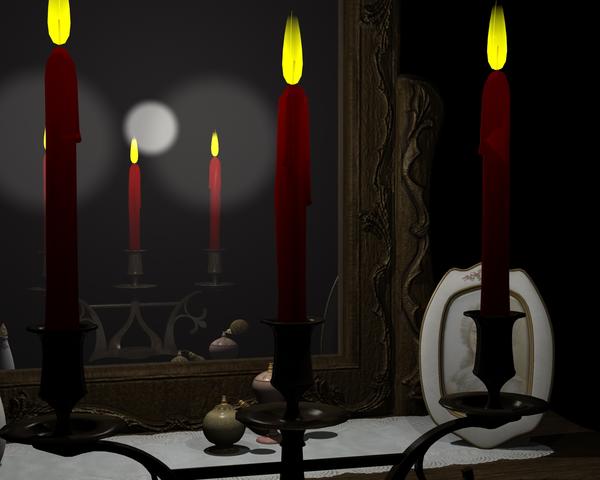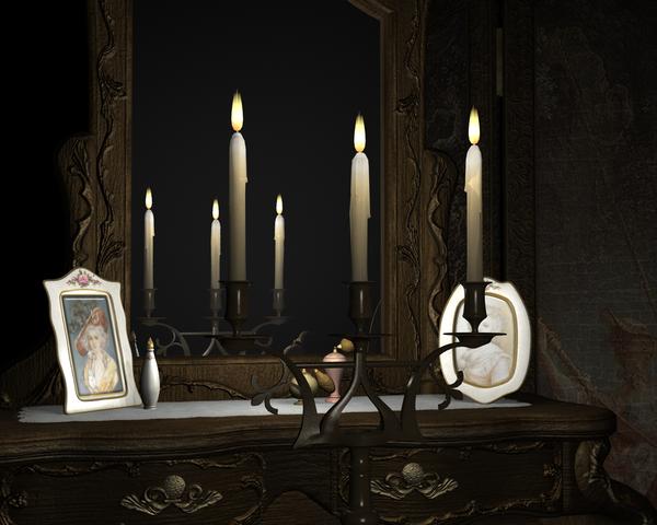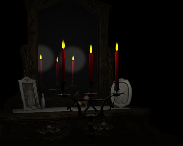 WOW...now this is a trip I changed the mirror to silver metal shader the reflection is a lot better now.....just got to kill the light reflections...either that or move them to the candle light itself...but I am having a little progress...what do you think Jade?? ok well this looks better to me more the effect I was looking for.....cool the room now looks like it is only lit by the candles....