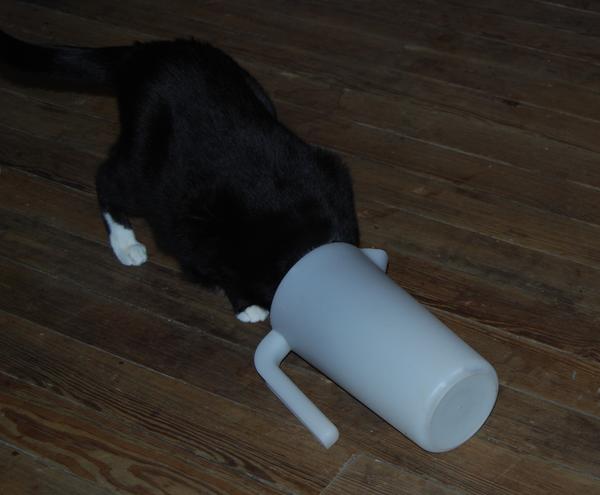 I had to post this about my cat ...every time I fill her water bowl with this pitcher... she must see if anything is left inside of it....and ends up pushing it around the room....LOL Trish