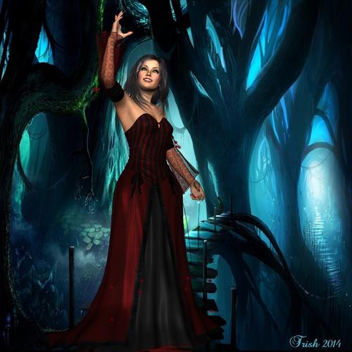 Trish, you've come a long way in lighting, the scenes have a delightful contrast in light and dark areas, and the composition really provides the opportunity to showcase what you're trying to do- great placement. I like the swan very much! The wicked woods makes the viewer wonder what is creeping up on her, but she seems confident enough to handle (or contribute to) the situation. Beautiful!