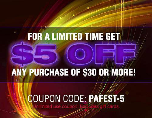 We have extended the PAFEST-5 coupon. It is now valid again. We have also updated it to an unlimited use coupon. So for a limited time, you can save $5.00 off of every $30.00 purchase you make. There is no limit to how many times you can use this coupon code.