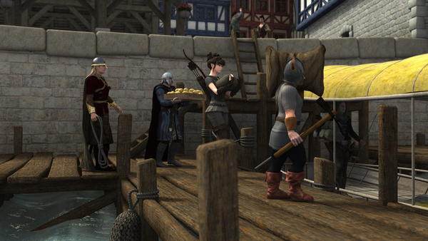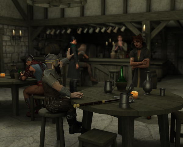Lóni went to the tavern and ordered a great meal for himself and a few tankards of ale. He then handed the tavern keeper a nice pile of money and said: "I want the boat lifters to eat and drink as much as they can tonight, and hand each of them two silver coins for their services. I also need two kegs of your best mead and some travelers food pack of your food. Be sure to have it all ready in an hour as my boat is being lifted as we speak. I'm in a hurry, dwarven business. Have you seen a dwarf named Funhir, son of Fundin, passing by recently?". The barkeeper does remember the dwarf with the horned helmet and said: "My dear dwarf, your friend Funhir was here just last night. He left in the morning with some friends. I was a little chocked to see him in the company of an elf.".