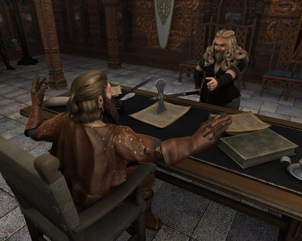 Glóin was chocked, but he knew what dwarven women were like, he was married to one himself. He also knew how important it was that the husband was nearby when the child, or in this case children were delivered. He looked at her and said calmy: – "My dear lady, I will send someone to replace him and order him back home. I will send Flói, son of Lóni, and I assure you your husband Funhir will soon be home again. I am so sorry for this, I should have checked with him first. Now, can you please remove your axe, I was reading that document and it is somewhat disturbing to have a blade in it."