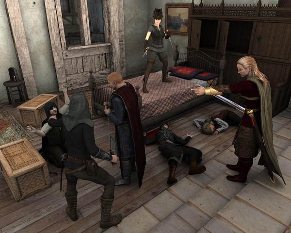 Eirik rushed to the stair inside and picked up a sword he had hidden under some clothes, just in case and went up the stairs. Lomund followed him. Miriel showed off by parcouring up the wall of the house to the bedroom windows and saw two person busy looting through the room. On the floor was a woman laying, wounded.