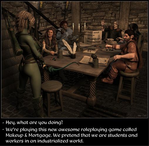 The Makeup and Mortgage has really awesome lighting- I noticed the folds of the pants/leggings material of the man closest to us on our right- it looks so soft and supple that it's almost like we can reach out and touch it. Awesome! Your characters always have such good expressions too.
