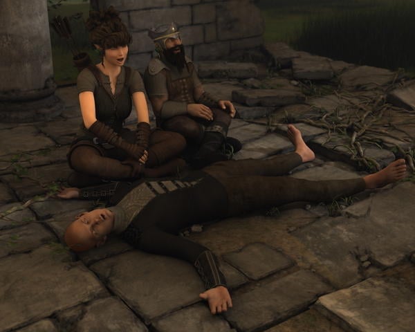 Flói climbed the rope with a little help from Miriel and Lomund shouted again: – "We're out of here, come now!" but Gorm just shouted back to him: – "No way, he is almost down, my enemy is almost down, then we can leave, when they all flee."