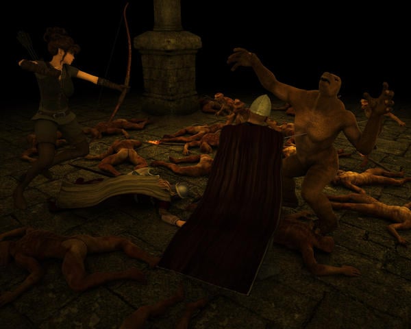 When Miriel heard the desperation in Gorms voice when he yelled: – "Eirik is down, Eirik is down", she made a brave decision and jumped without hesitation down the tower, scaling the walls and pulling her bow, and when she came down she shot the closest lizard man bulls eye in the head. Her dramatic entrance startled the leader, who for a fraction of a second lost his concentration, and Gorm drew his sword into his chest, and the large leader fell silently on the ground.