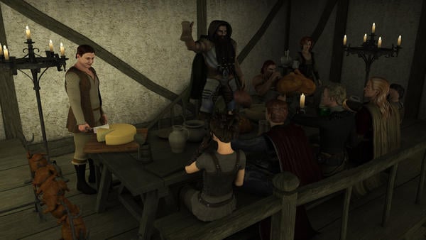 After four eventless days in the Long Marshes, the group finally came back to the civilized world at the Girion stairs tavern. They all decided to take baths and wash some clothes to rid them of terrible stench of the lizard men, or marsh dwellers as the barkeeper at the Girion stairs called them. It was almost like the very first time they met, just a few weeks ago at the Singing Minstrel in Lake Town. Ale, beer and wine, good food and a warm fire. But this time they had their own story to look back at, something they had done together that had built bonds between them that no preconceptions could touch. Balin stood up on the bench with a raised tankard of mead and shouted: – "Let's drink!", while Óin was busy with his large roasted chicken.