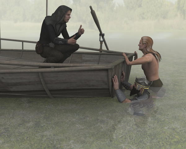 Flói didn't hesitate more than a second before he jumped into the cold water and started to try to push and rock the boat free. When in the cold water he realized that the water was rather deep, only his head and arms were visible above the surface. Eirik took of his armor and jumped into the cold water too, and together they tried while Lomund tried to give the directions and cheers. C'mon boys, you're almost there. They pushed and liefter and Eirik got the boat loose on his end a few times, but Flói was rather encumbered with all his armor, in the deep cold water, which made him sound more energy carrying his weight than actually pushing and he started to get tired and cold. Suddenly Miriel called out from her lookout position: – "Hold it, we're being watched."