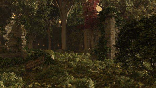 They walked for a while when they came to a glenn in the forest, and there were several old ruins, ruins from forgotten times. Lomund thought it might have been a small woodsmen village, abandoned a long time ago. Several black birds had been following the adventurers, and Lomund even tried to shoot one with his bow, but missed. Here, among the ruins, there were many black birds, circling or sitting in trees. The whole place made them feel depressed and low, like someone had put a heavy burden on their shoulders.