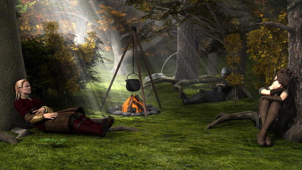 When they look out through the opening, the see that the storm has calmed down and the rain is only a soft shower, which feels pleasant compared to the past days rainstorms. They ride out again and several days goes by without any events worth noting, three days passes and on the twenty-first, the rain has stopped completely. The group starts which a good porridge breakfast, it all felt so right, and when it was time for a lunch break, Gorm saw a perfect spot, a nice clearing where a few rays of sunshine came through the dense tree crowns. They made a fire, and had some dried meat, and even a few sausages was added to the meal, and after eating they all felt a little drowsy. Eirik almost lied down against a tree and closed his eyes. Baldor had to nurse Belgo as he had some bad dreams, he was yelling mommy! mommy! in his sleep. Miriel also took a short nap, while Gorm was working, as usual, on the his sword, keeping it sharp as a razor.